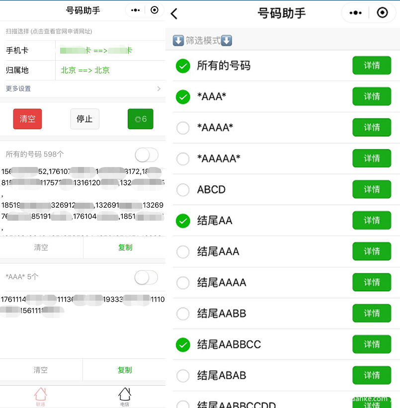 网络上存在多种通过爬虫技术进行靓号手机号搜索的工具,选择手机卡类型,再不断爬取待售手机号,寻找到符合理想靓号规则的号码。下图为某扫号工具截图,可选择数十种不同的互联网套餐卡:
