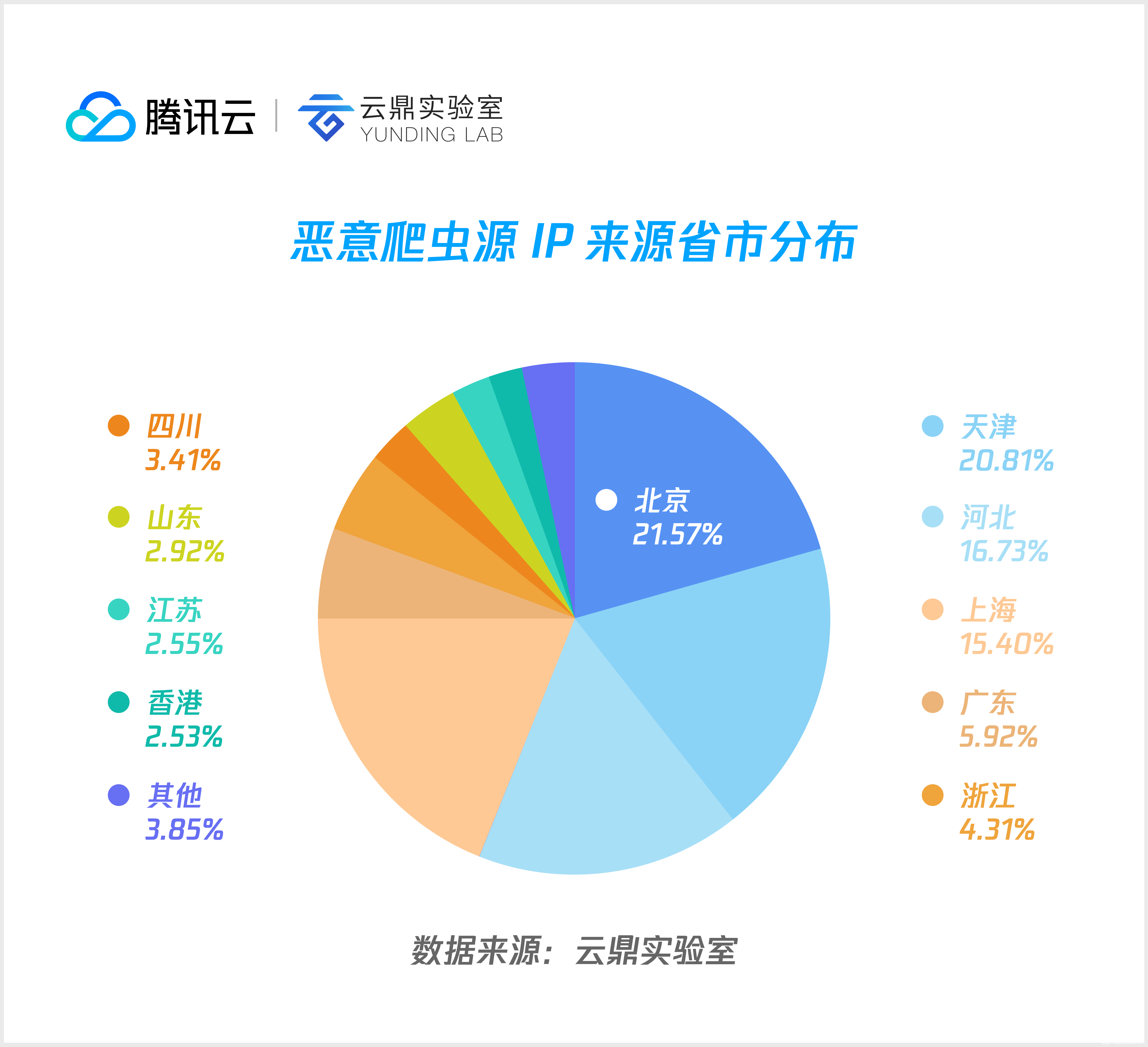 将源自国内的数据抽出来进行细分,可以看到,主要来自北京、天津、河北、上海等省市,以上4个地区所占国内恶意爬虫流量超70%。这并不是因为爬虫作者都来自这些地区,而是因为大量的爬虫部署在租用的 IDC 机房,这些机房大多在发达省市。