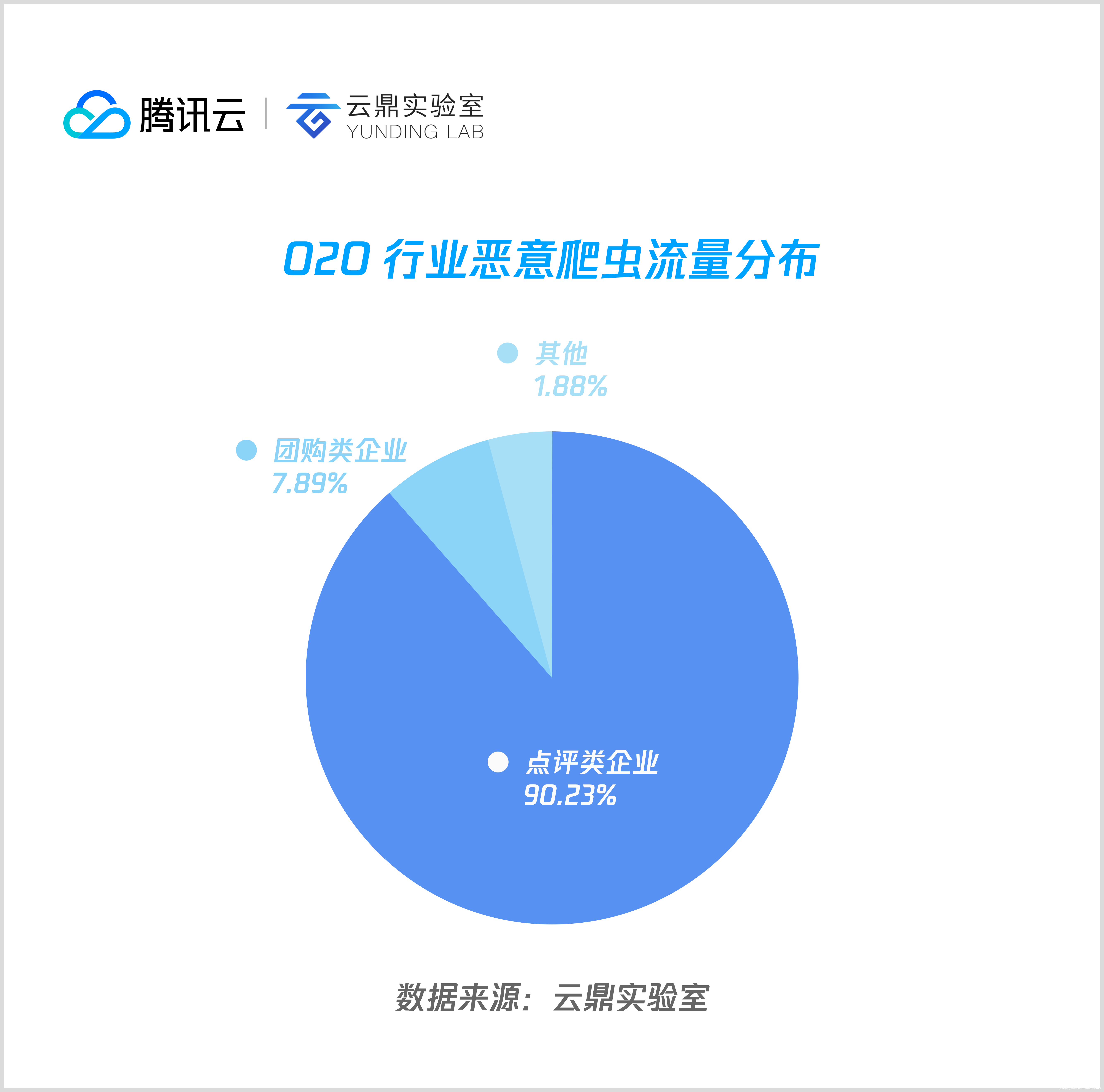 O2O 行业恶意爬虫主要集中在点评类和团购类公司,其中以爬取商铺动态信息和星级评分信息的点评类数据为主,占总数的90%以上。