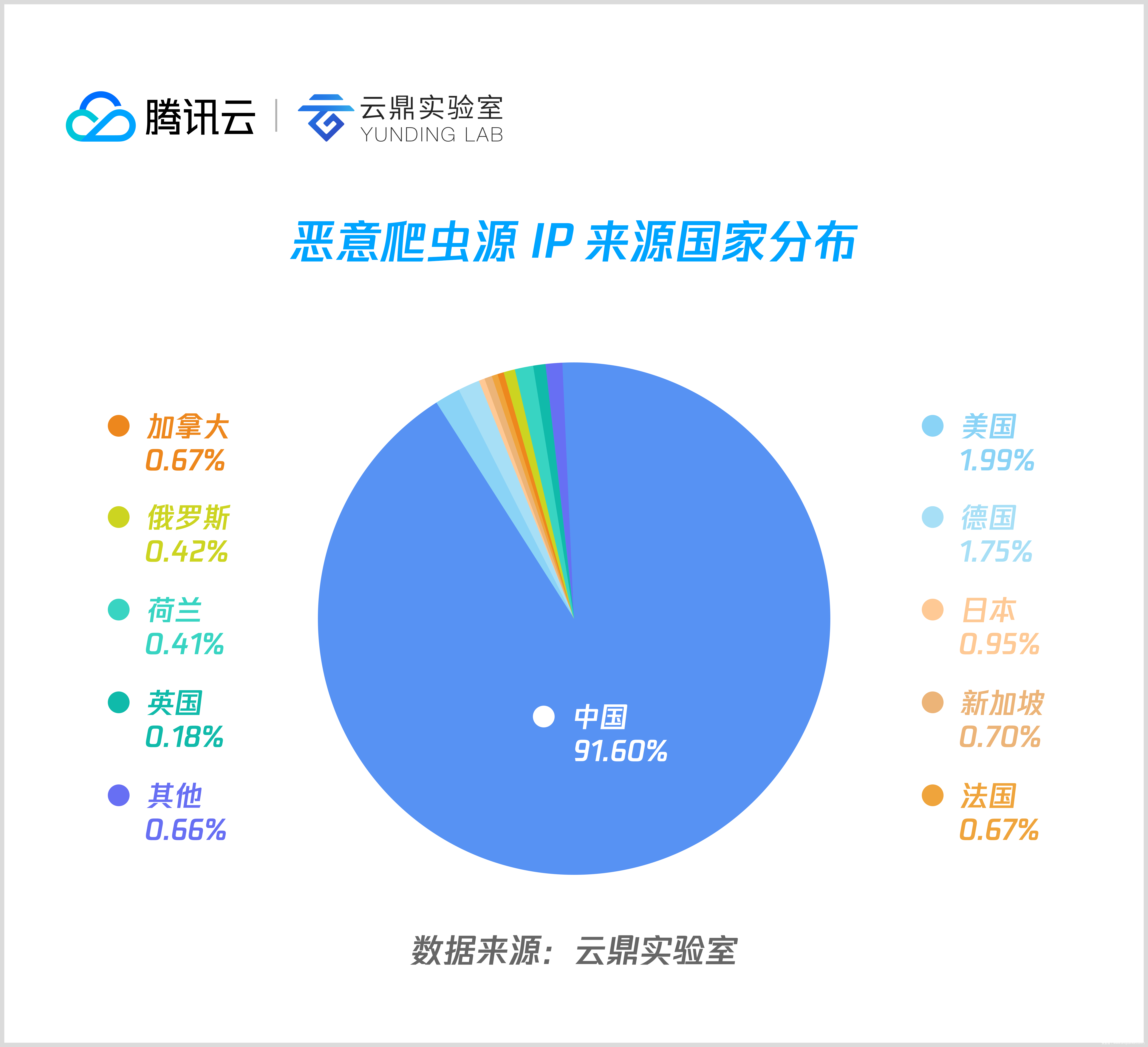 从本次半年度统计捕获到的爬虫流量源 IP 来看,大部分都来自国内,超过90%,其次主要来自美国、德国、日本等国家。