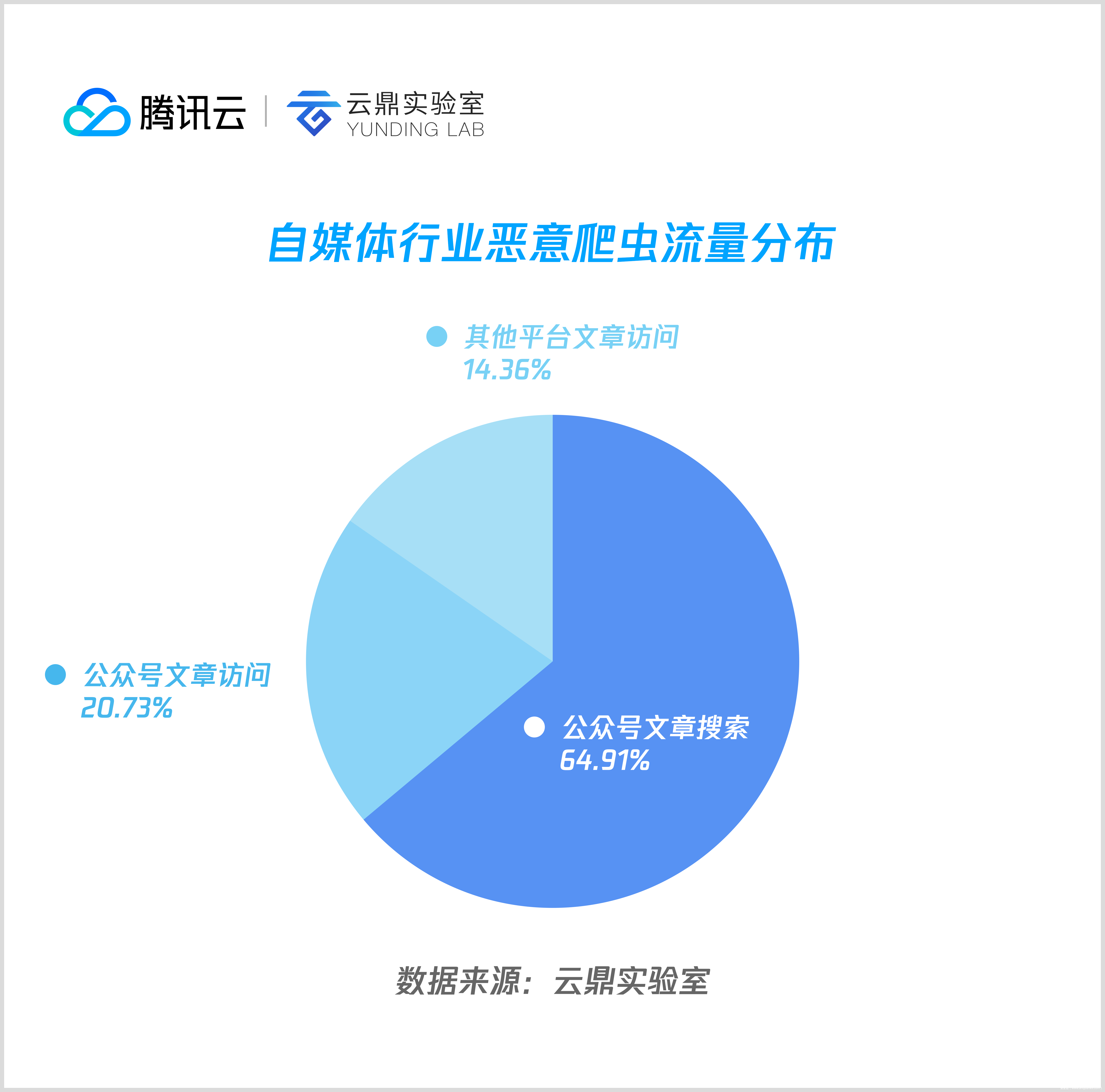 根据本次统计,自媒体类爬虫主要集中于微信订阅号关键词搜索和文章访问,分别占总量的64.91%和20.73%,其他自媒体平台约占14.36%。