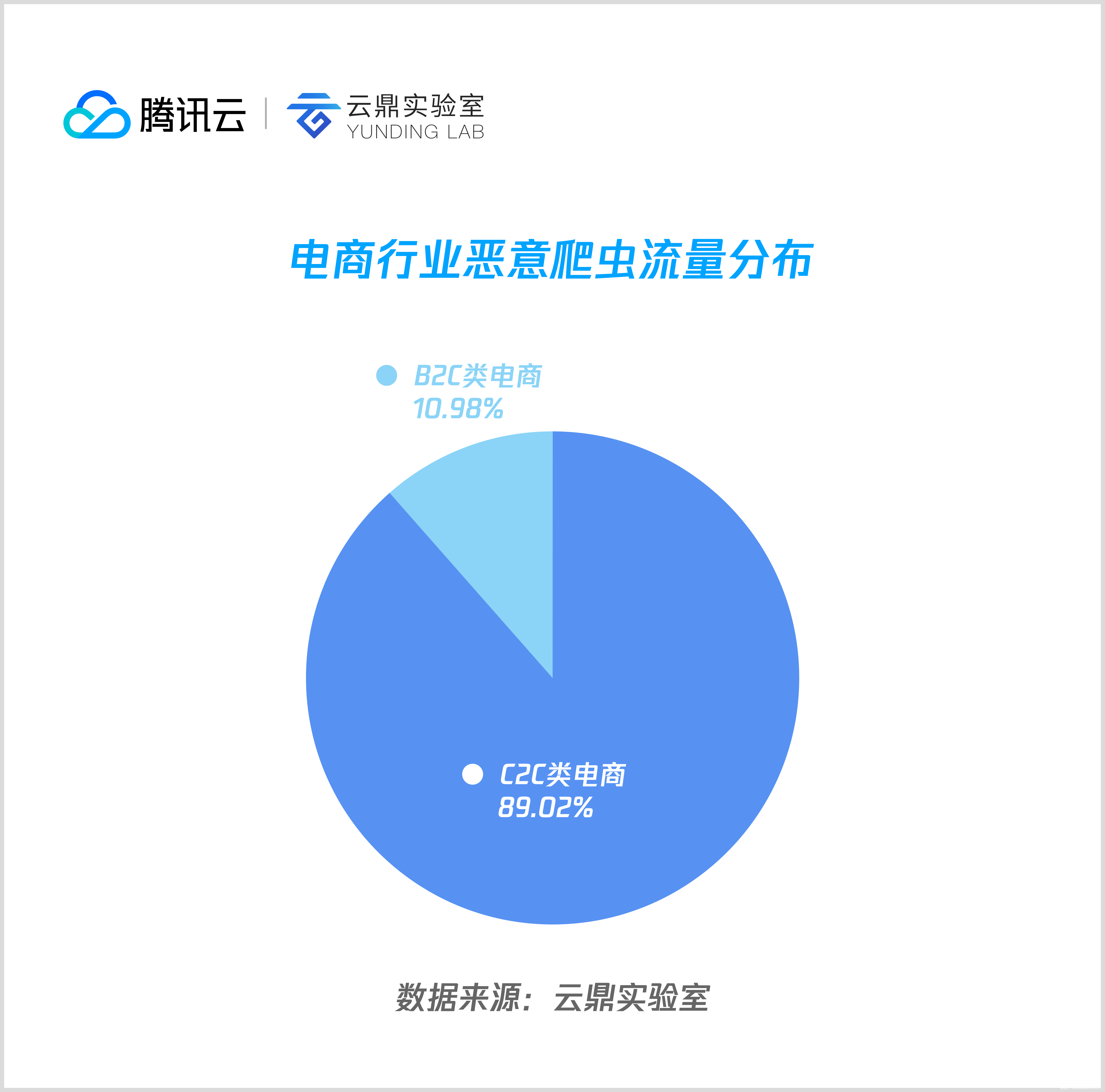 电商行业爬虫主要是爬取商品信息和价格等数据,由于商业模式的差异,C2C 类电商由于中小卖家众多,商品数量远多于 B2C 类电商,支撑了电商类恶意爬虫近90%流量, B2C 类电商加起来占一成左右。