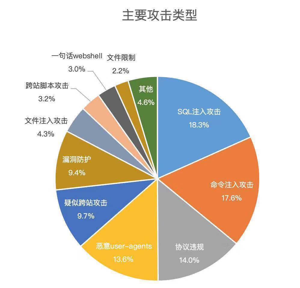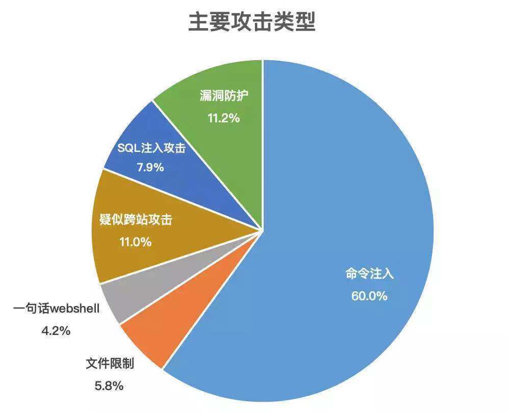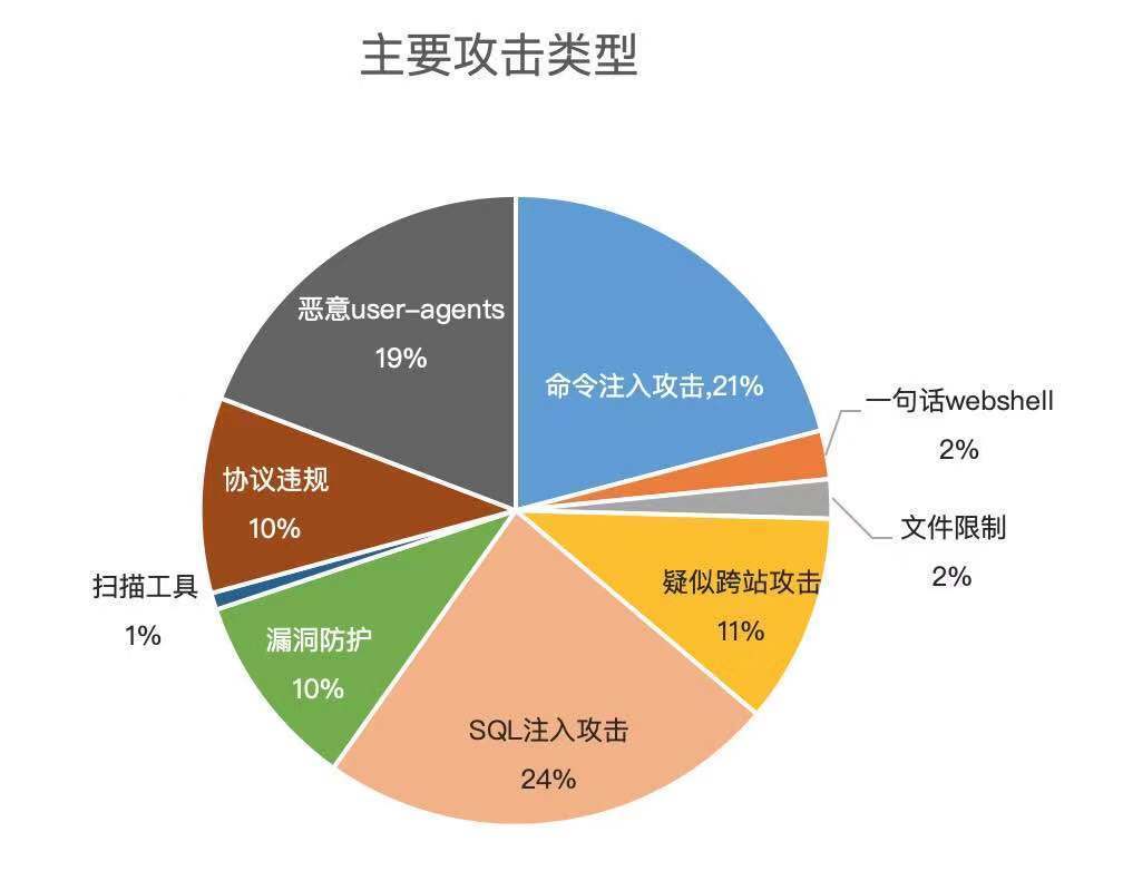 期间Web攻击类型以SQL注入攻击、命令注入攻击、漏洞防护等居多,主要攻击类型分布如图: