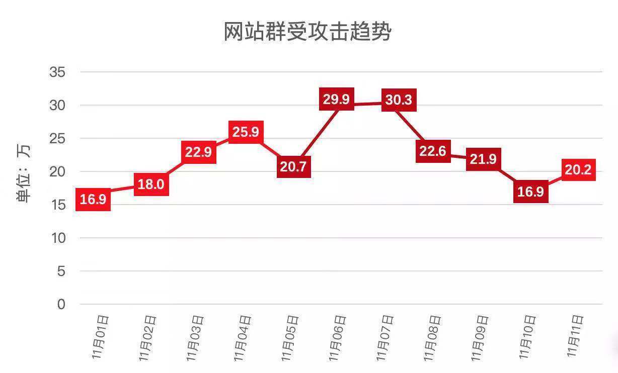 上图是11月1日-10日重点网站所受到的攻击趋势图,可以看出:会议筹备前夕,网络攻击趋势比较平稳,平均保持在50万次/天;在世界互联网大会开幕的前一天,攻击量开始攀升,达到112.71万次,同比增长约2倍。