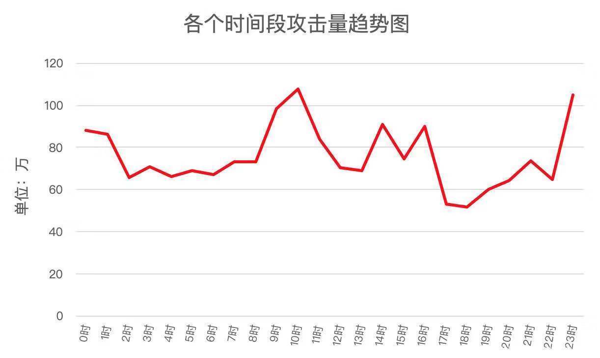 从时间分布上看,9:00-11:00,14:00-17:00,23:00-凌晨1:00,是网络安全攻防的高峰期;凌晨2:00-8:00,网络攻击相对较为平缓,保持在65万/小时左右。