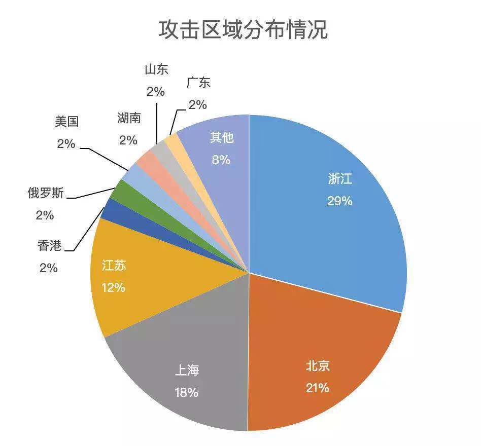 本次时间分布趋势图比较独特的地方在于:午夜时间段,网络攻击态势处于猛烈状态,22:00-23:00的攻击量超过100万次,与白天攻击态势最高峰的数据量几乎持平。