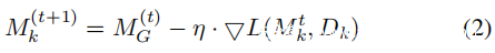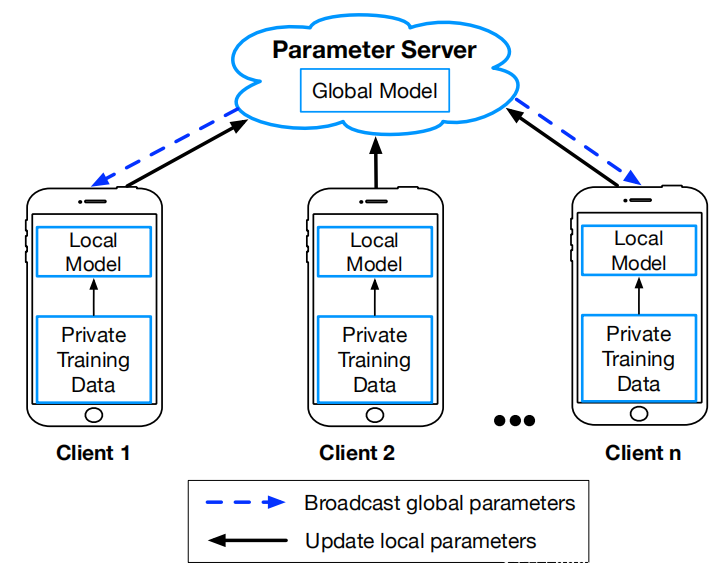 考虑一个由N个参与者$O^k$(k≤N)组成的联邦学习设置,每个参与者都可以访问本地私人训练数据集Dk和中央参数服务器S(如上图所示)。在每个时期t,每个参与者$O^k$训练具有本地参数向量$M^t_G$∈$R^n$ 的新本地模型,其中n是参数空间的维数,并将模型(即对应的参数向量)发送给S。 S从所有参与者接收$M^t_k$(k = 1,…,N),它执行FederatedAveraging算法以获取具有全局参数矢量$M^t_G$∈$R^n$的新全局模型。