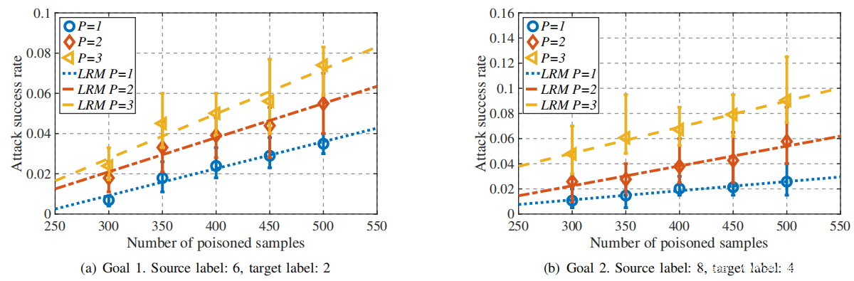 分别检查了不同数量的投毒样本和攻击者对目标1和2的攻击成功率,如下图(a)和(b)所示。此外将投毒样本的数量和平均攻击成功率分别视为自变量(x)和因变量(y)。考虑到特定数量的攻击者,根据不同数量的投毒样本下的平均攻击成功率进行线性回归估计。估算的线性回归模型(LRM)y = kx + c示于上表,其中k和c分别表示斜率和截距。