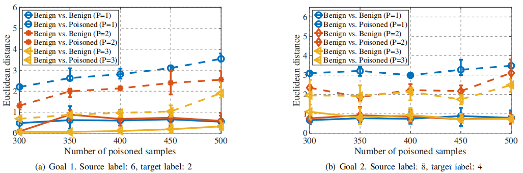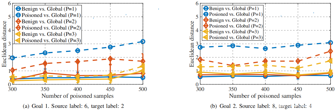 然后,对于每个攻击目标,分别计算在不同数量的投毒样本和攻击者的情况下,良性本地模型和MG之间以及投毒本地部模型和MG之间的平均,最大和最小欧几里得距离。 根据下图(a)和(b)所示的实验结果进行以下分析: