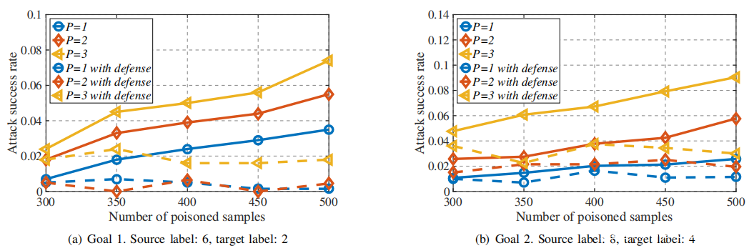 2)攻击者数量的影响:对于一定数量的投毒样本,当攻击者数量P增加时,每个攻击者获取的投毒样本就会减少,因此从投毒模型到MG的模型距离会减小。 但是,投毒攻击的效率提高了(攻击成功率提高),这是因为全局模型聚合中涉及了更多的投毒本地模型。 此外,将投毒样本分发给更多攻击者也意味着服务器更难识别每个投毒本地模型。