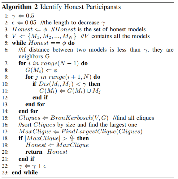 最大团问题是经典NP完全问题之一,使用BronKerbosch查找所有团,最大的就是最大团(诚实的用户候选集),如算法2所示。