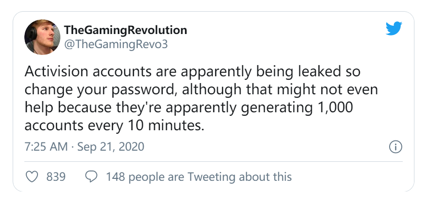 这起事件由推特上的“oRemyy”最先爆出,这一观点随后被其他内容创造者证实,比如TheGamingRevolution、Prototype Warehouse和Okami。他们发推警示玩家,《使命召唤》不少账号的登录信息遭到公开,黑客会改变账户的详细信息,使原始所有者无法恢复。同时也提醒到,用户最好尽快更改自己的账户密码。在黑客每10分钟就能窃取1000个账户的不利局面下,修改密码可能成效不大,但也只能死马当成活马医它一把。
