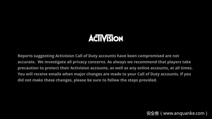 不过,9月21日动视暴雪出面澄清了这一“乌龙”,宣称有关动视公司《使命召唤》账户被盗的报道并不准确,表示他们一直鼓励玩家随时随地采取预防措施保护他们的动视账户。