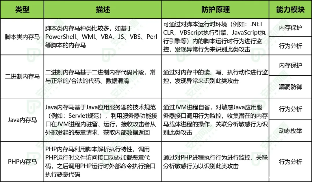 1、内存马无逻辑结构边界,难以被发现内存马仅存在于进程的内存空间中,通常与正常的/合法的代码、数据混淆。内存马与传统恶意代码的不同之处在于它没有磁盘文件,会导致传统的检测防护手段失效。2、内存马缺乏稳定的静态特征,难以被识别内存马缺乏结构化的静态形式,它依附在进程运行期间的输入数据进入进程,数据可能被加密混淆,因此,无法通过特征识别内存马。3、 内存马种类多,检测机制复杂而多样内存马有二进制代码片段(Shellcode)、PowerShelll脚本、Web中间件等类型,每种类型又可细分,不同类型内存马的执行方式、恶意代码/行为触发机制各不相同。