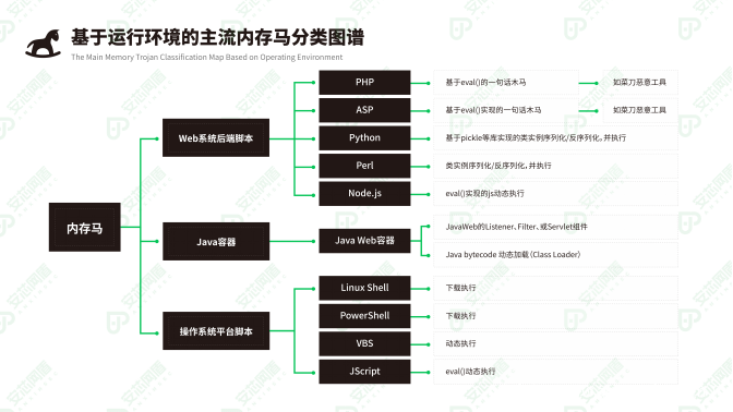 当前黑客攻击的目标不仅仅局限于终端,针对服务器的攻击也在日益增多。通过分析和梳理,内存马攻击通常发生在Web系统后端脚本、Java容器和操作系统平台脚本中。我们总结了部分基于运行环境的主流内存马分类图谱,如下图所示: