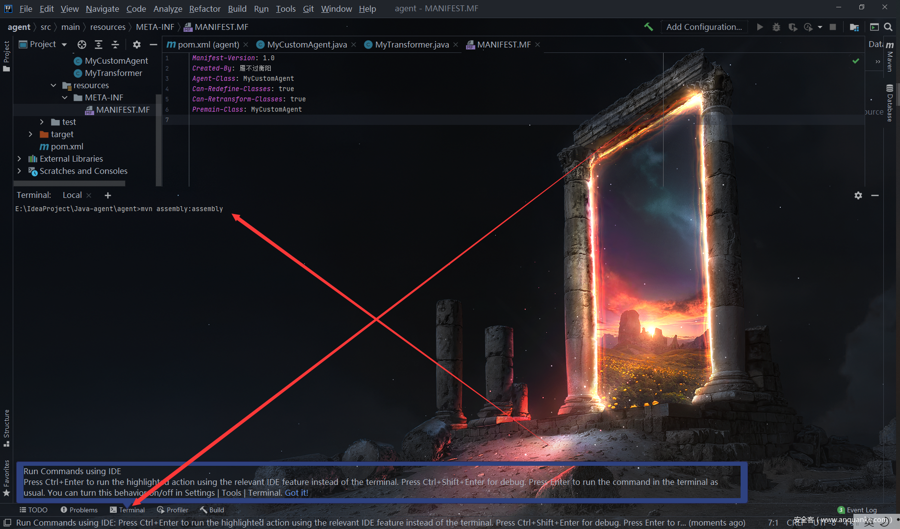 6.最后 Java Agent 是以 jar 包的形式存在,所以最后一步就是将上面的内容打到一个 jar 包里。