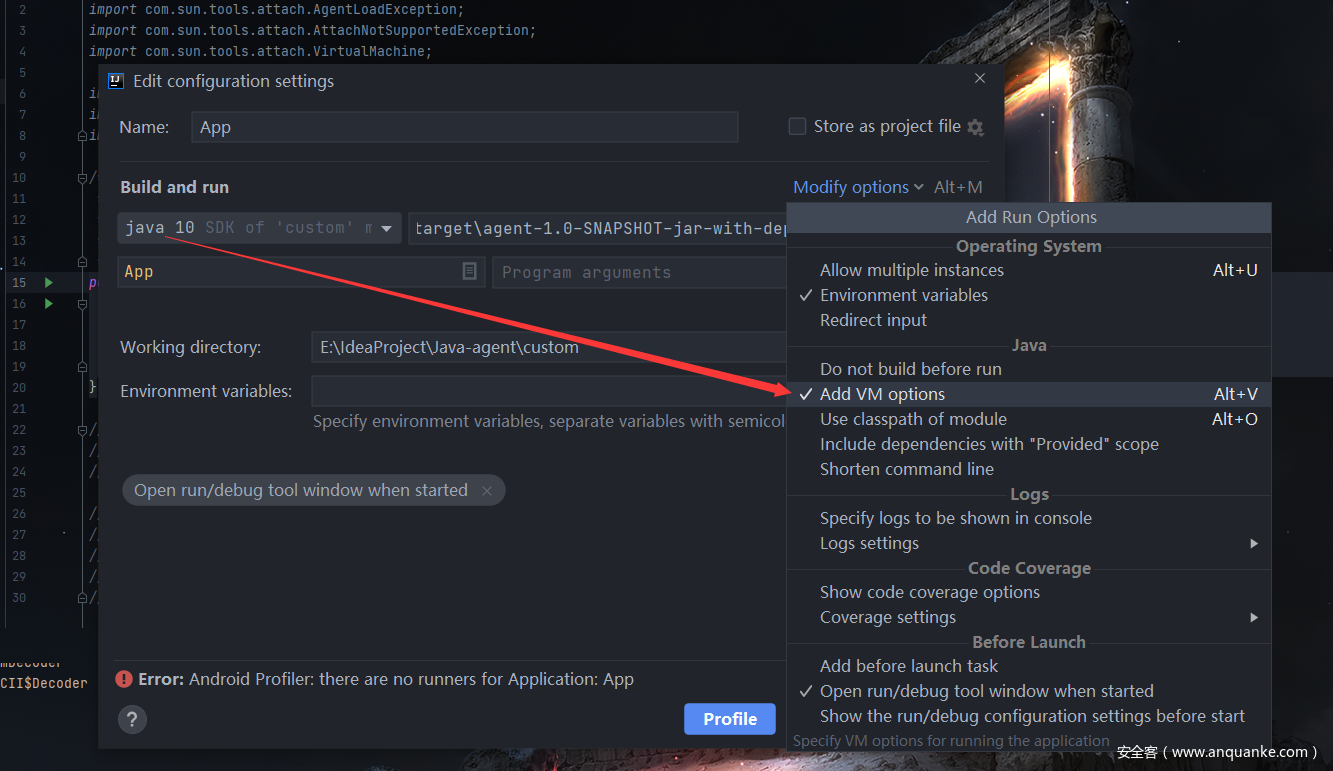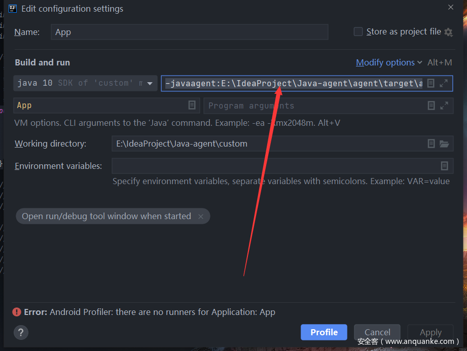 -javaagent:E:\IdeaProject\Java-agent\agent\target\agent-1.0-SNAPSHOT-jar-with-dependencies.jar