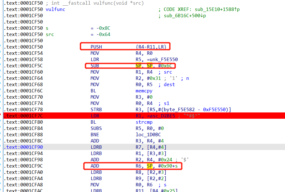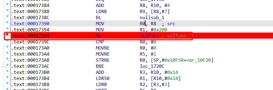 接着往下执行,vulfunc函数 会把栈上的地址复制到 r4~r11,pc 寄存器中