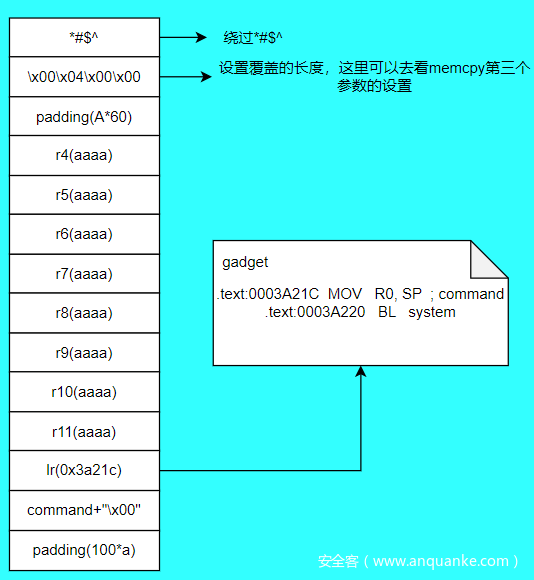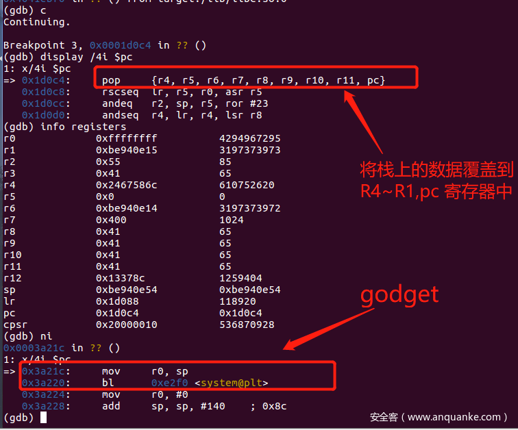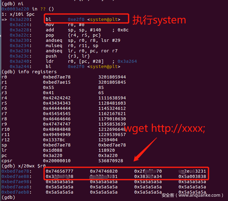 接着往下执行到system 函数,可以看到 $r0 寄存器地址上的值是我们要执行的command。接着往下执行就会达到执行命令的效果