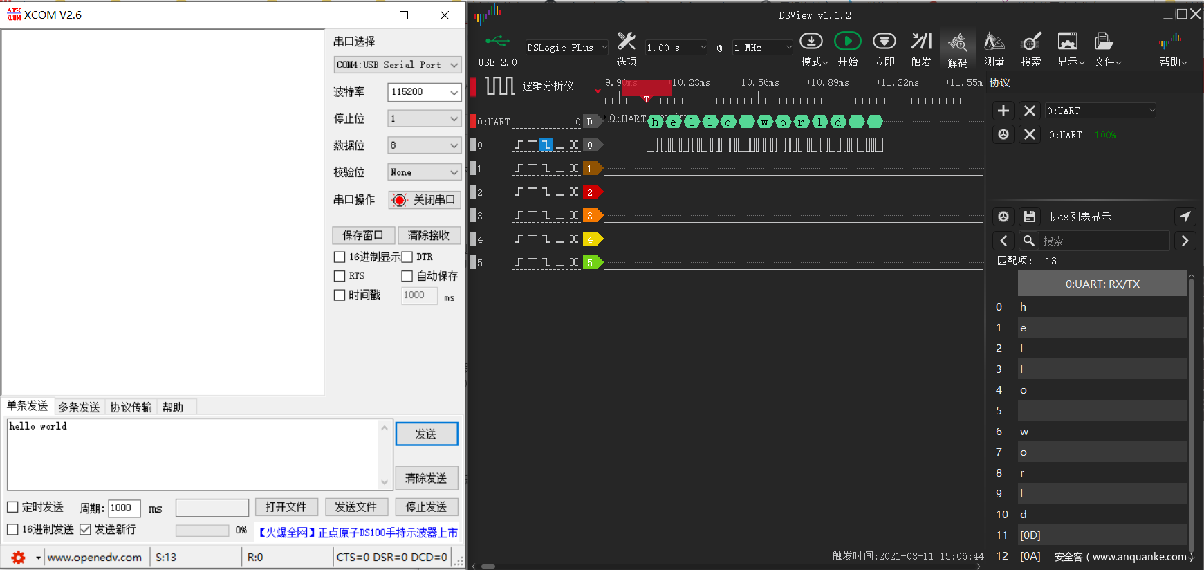 这里的DSView 工具中参数的设置需要去看说明文档,点击“开始”按钮,采集数据,然后使用XCOM串口工具设置好波特率和串口,打开串口后,设置发送的信息,点击发送即可。然后在DSView 就可以看到采集的信息了。采集完之后设置好解析,就可以看到对应的信息了