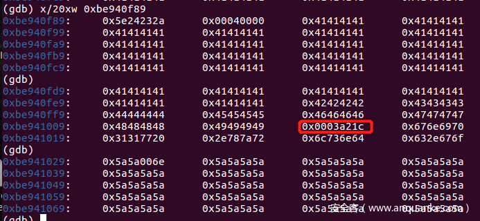 查看0xbe940f89 内存地址中的值,可以看到内存中成功的被覆盖了构造好的数据。