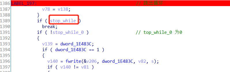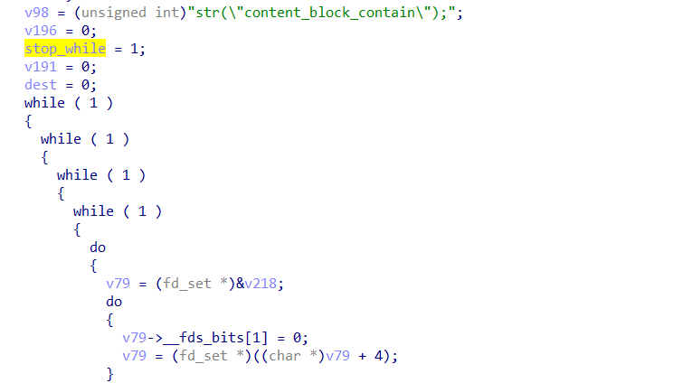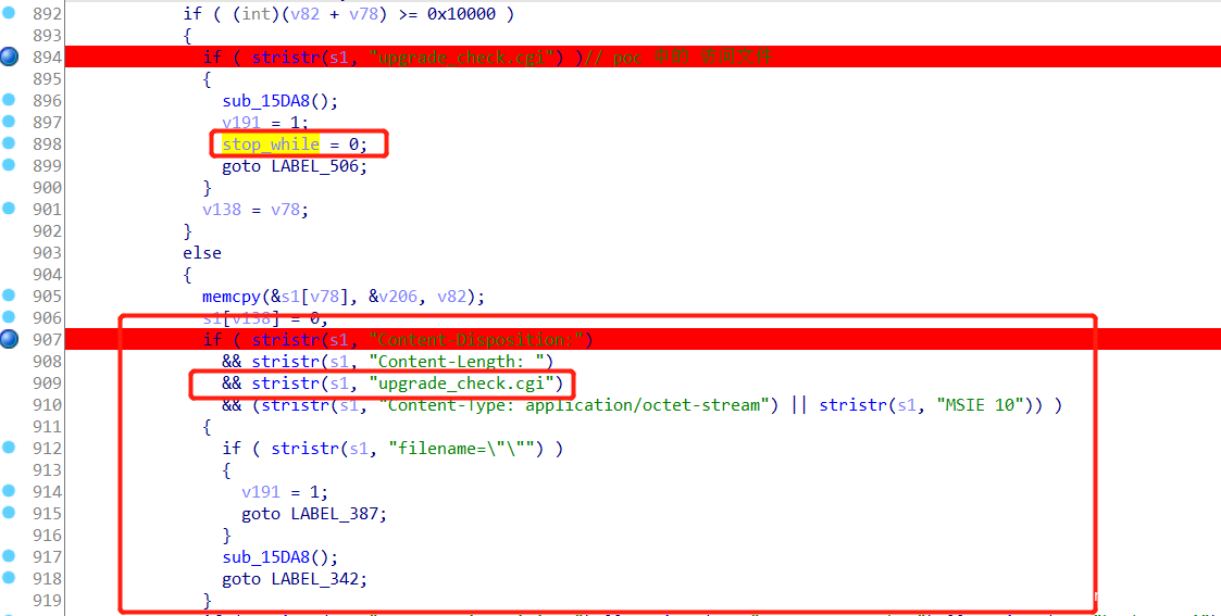 首先根据公开的poc 开分析,漏洞产生的点有 “ upgrade_check.cgi “ 的字符串,可以定位到如下图的代码段。可以看到有两处,很明显是下面的判断才能使程序继续往下走,因为第一个判断里面讲初始化的stop_while 原本为1,设置为0,会导致程序去校验其他的文件,无法达到漏洞点。