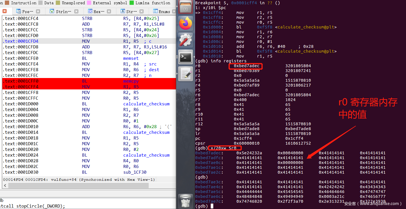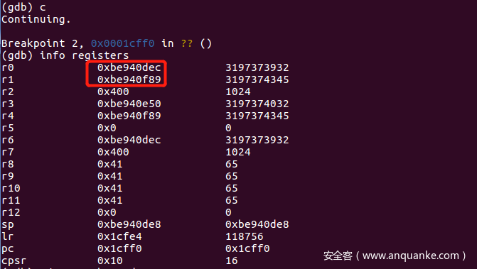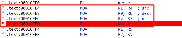 然后接着“continue” 往下执行,执行到 0x0001cff0 断点位置会执行 memcpy 函数。