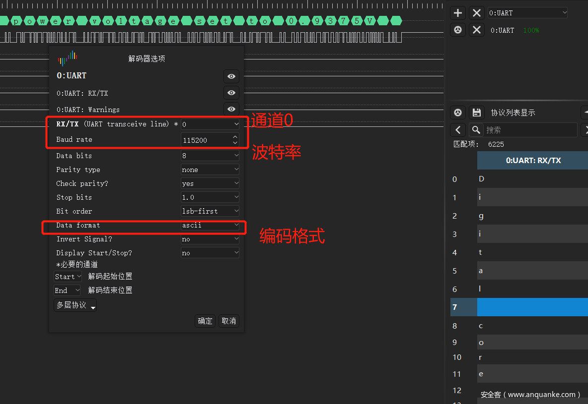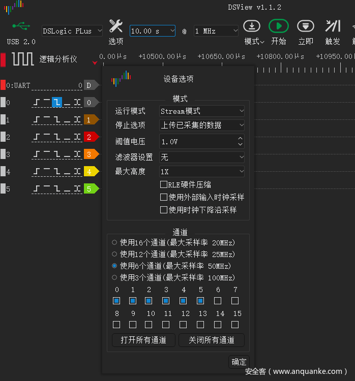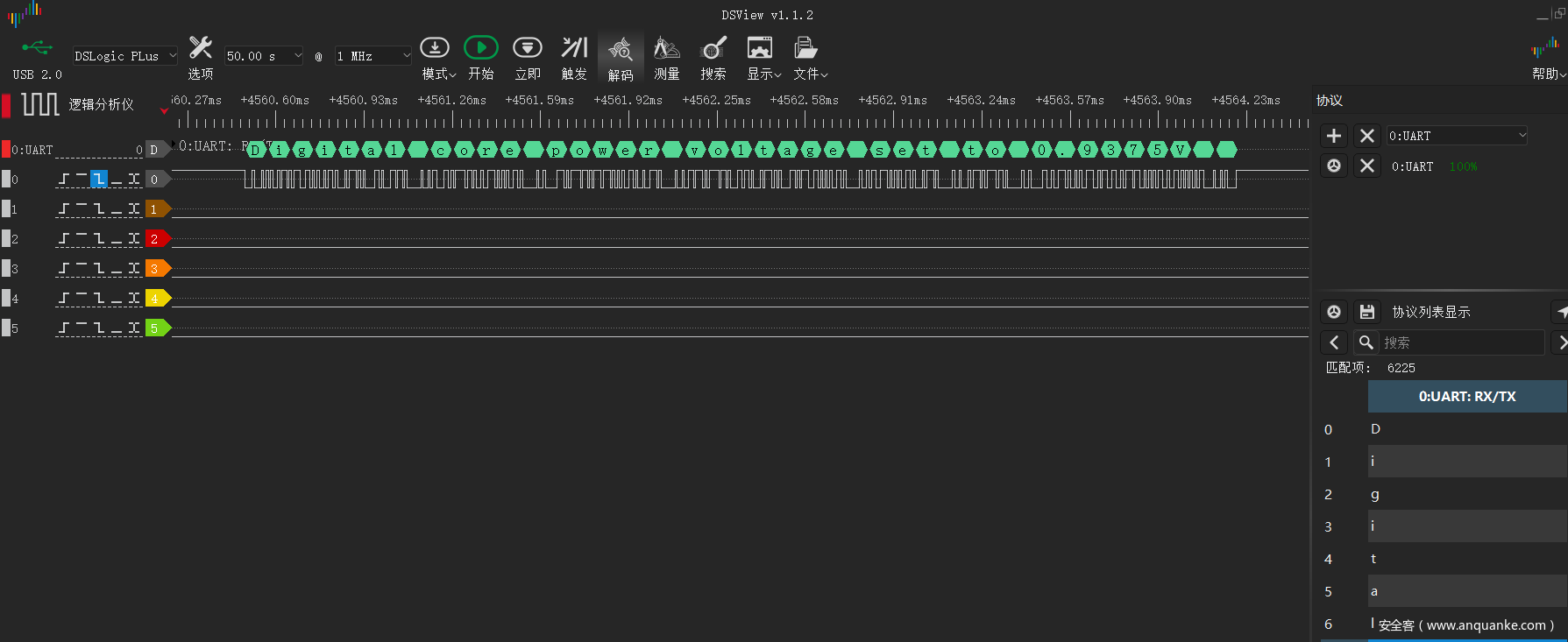 确定波特率有不同的方法,基本上常见的波特率都试一遍,一般都可以确定串口的波特率,但是这里介绍使用DSLogic 逻辑分析仪 来确定UART串口波特率。