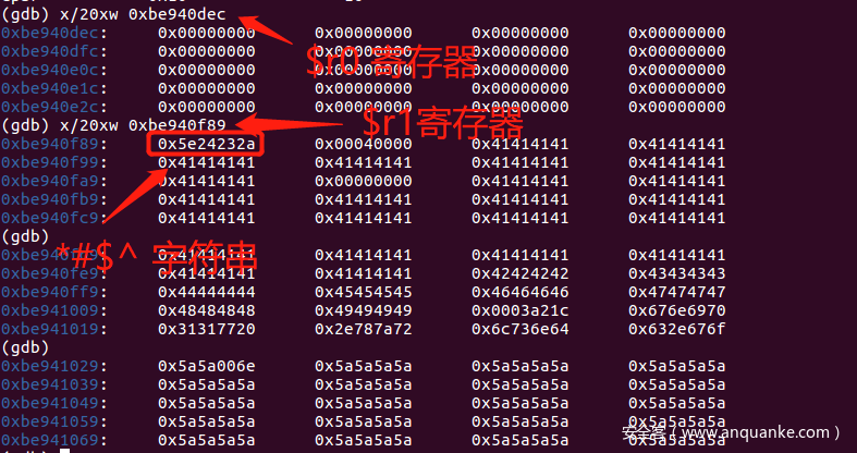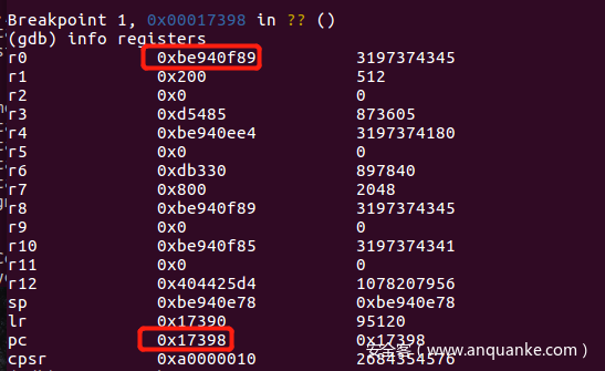 接下来我们看寄存器的值,可以看到$r0 寄存器的值为 0xbe940f89
