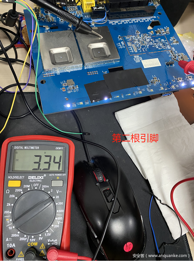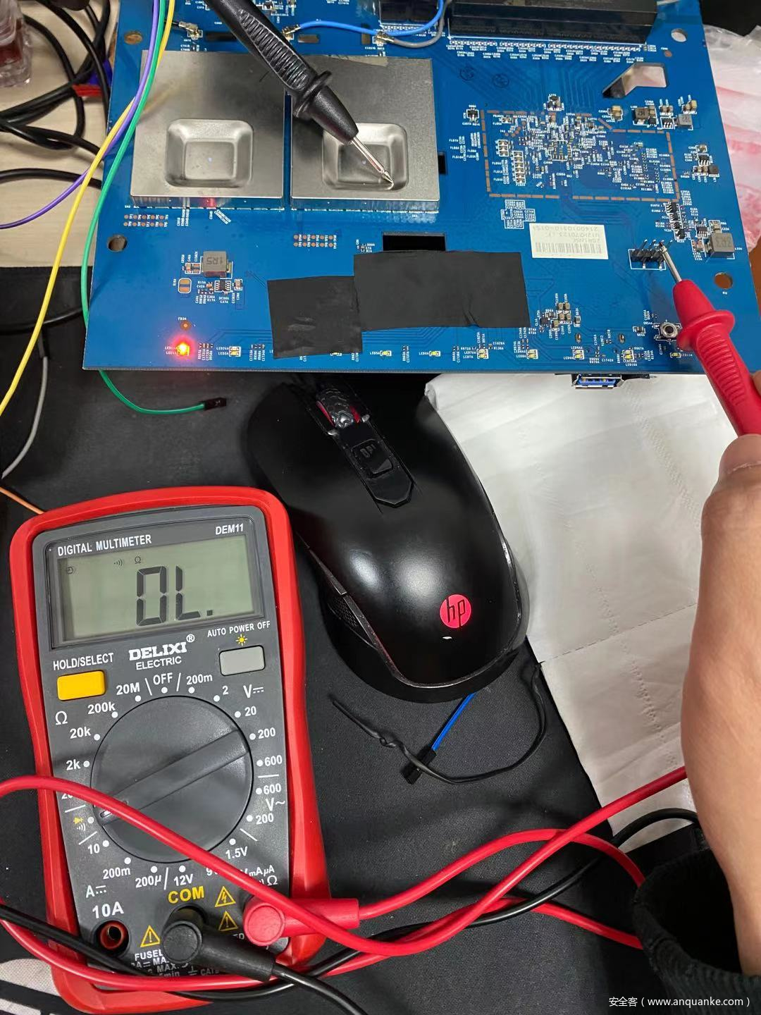 万用表的黑色探针放在地面或者任意金属面,红色探针分别在4根引脚出逐一测试,直到听到滴滴或者哔哔的声音。下面这块PCB设备,第三根是GND引脚。