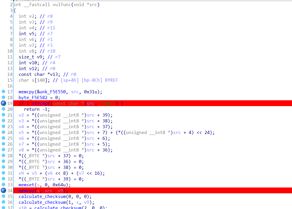 进入vulfunc函数,可以看到会对数据进行判断是否以”*#$^”开头。然后会将数据通过memcpy函数由src指向地址为起始地址的连续 v9 个字节的数据复制到以 s 指向地址为起始地址的空间内。并且可以看到 v9 的值是可以通过src 中的数据进行获取,因此可以进行通过控制 v9 的大小,将 src 的数据覆盖到 s 中,但 s 的大小只有140个字节,从而造成大缓冲区向小缓冲区复制的数据覆盖相邻内存内的数据。造成栈缓冲区溢出。