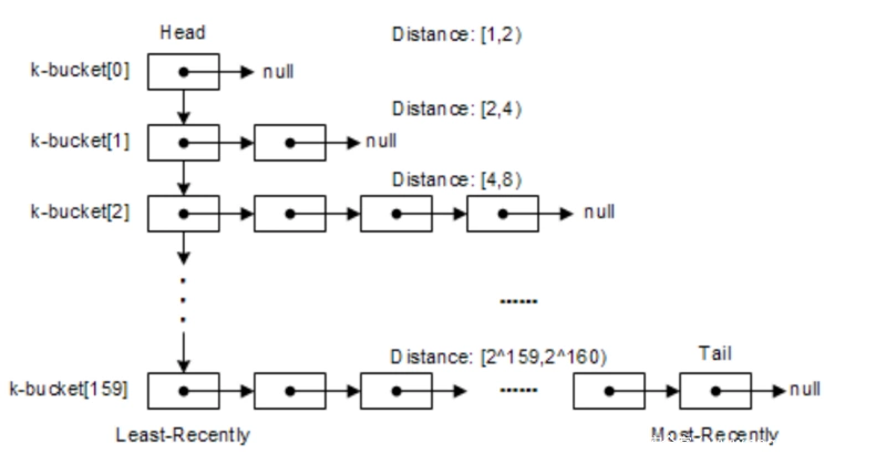 在实际使用过程中,考虑到健壮性(每个节点可能退出或者宕机)问题,只知道一个节点是不够的,需要多几个节点才比较保险。所以,Kad论文提出K-桶(K-bucket)的概念: