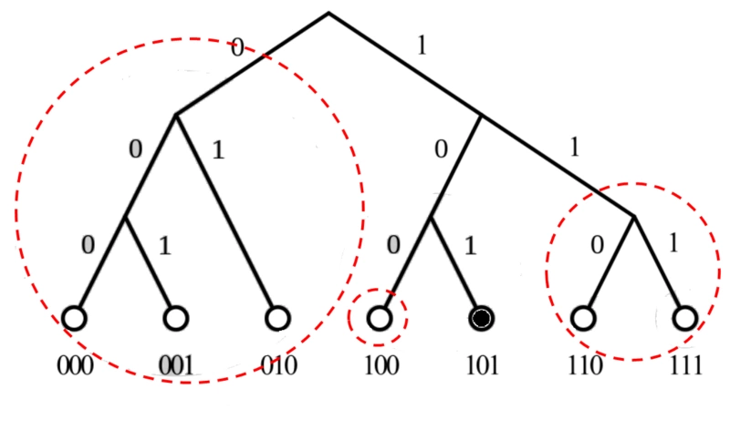 拆分规则是从根节点开始,把不包含自己的子树拆分出来,然后在剩下的子树再拆分不包含自己的下一层子树,以此类推,直到最后只剩下自己。如上图所示,以节点ID为6(110)为视角进行拆分,可以得到3个子树(灰色圆圈)。而以节点101为视角拆分,则可以得到图2的二叉树: