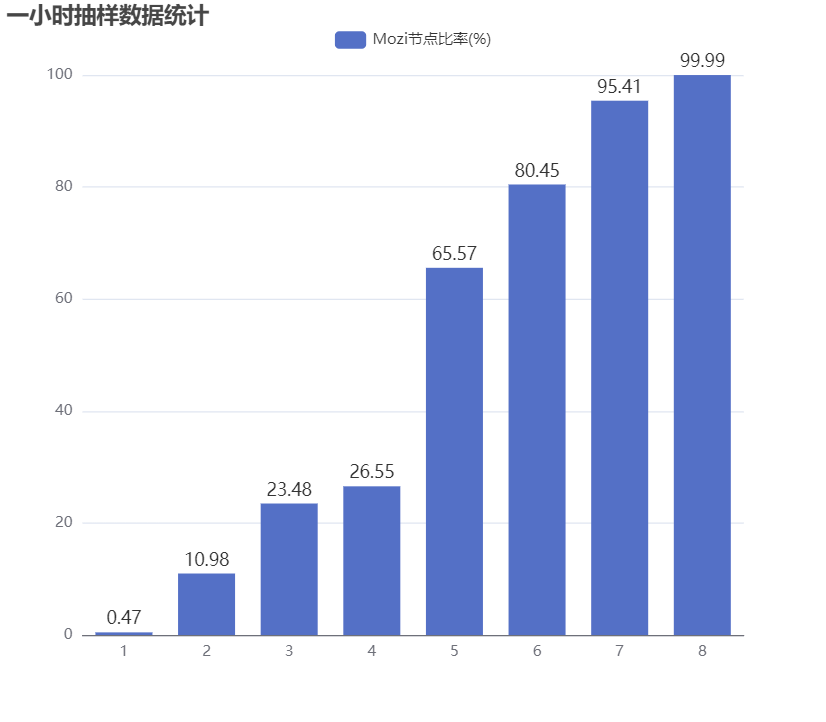 根据2.3节的金字塔存储模型划分层级1至8,我们统计了一小时内的活跃数据,并抽样100000个中继节点进行探测,根据其中的Mozi节点数量绘制图11。随着层级增加,Mozi节点数量也呈阶梯式增加。