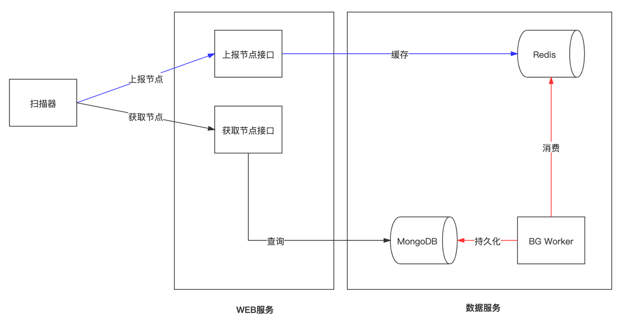 使用Redis缓存需要入库的节点,编写后台Worker消费Redis数据录入Mongo,完成数据存储。