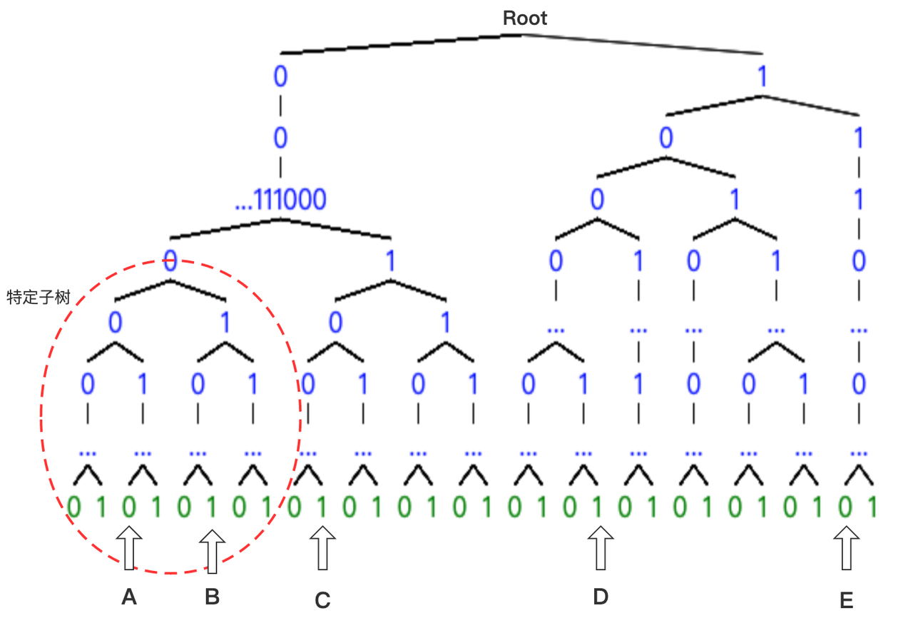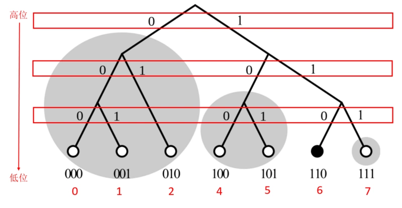Step3:如果当前位是1,进入右子树,如果是0则进入左子树(认为设定,可以反过来)。