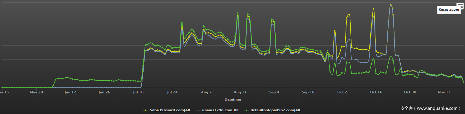 我们的 DNSMon 也感知到了这三个域名的异常,下面两张图分别展示这三个域名流量访问曲线高度拟合,并且在访问时序上有强烈的相关性: