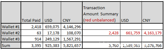 全部三个钱包的收入如下表所示,共计收入 3395 或者 5760 的门罗币,这些代币今天价值人民币 580万 或者 980万。注意:在第二个钱包付费记录中,”Total Paid”与逐笔交易累积得到的 “Amount Summary” 并不一致,我们无从确认哪个数字更准确,因此把两个数字都记录了下来。