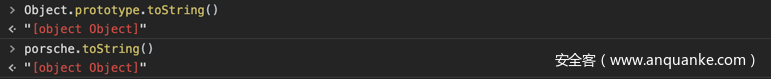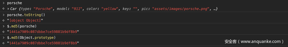 因为$.md5是对一串string类型的变量进行加密,那么传入的参数为对象时,势必就经过类型的转换。至于具体操作,我们可以把它理解为当前变量进行toString()。由于porsche这个对象没有toString()方法,按照Javascript的继承就会向上查找原型_proto(Car对象)是否有toString(),Car对象也没有toString(),继而再向上查找到proto_(Object对象),存在toString(),调用并返回字符串:[object Object],通过打印如下的例子验证。