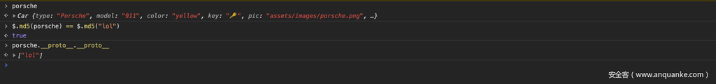 同时$extend()方法也存在原型链污染问题,见文章:https://hackerone.com/reports/454365。这也是bypass第二步$.md5(porsche) == $.md5(“lol”)的关键,那么如何操作对象常量porsche?