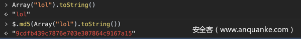 其次,对于数组的toString()会合并数组内的键值并返回,那么如下的用法会使$.md5生成以”lol”为字符串的加密值。