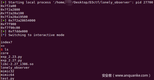 前面的调试工作都是在单独测试32位或64位程序中进行的,即使能分别getshell也不代表最终的getshell,因为这过程无法测试出输出是否相同。还需要用给的lonely_observer服务端程序对两个程序同时测试,如果程序崩溃说明存在输出的信息不同,原因可能是两个服务不同步(如缺少sl(‘a’*(0x100-j)))