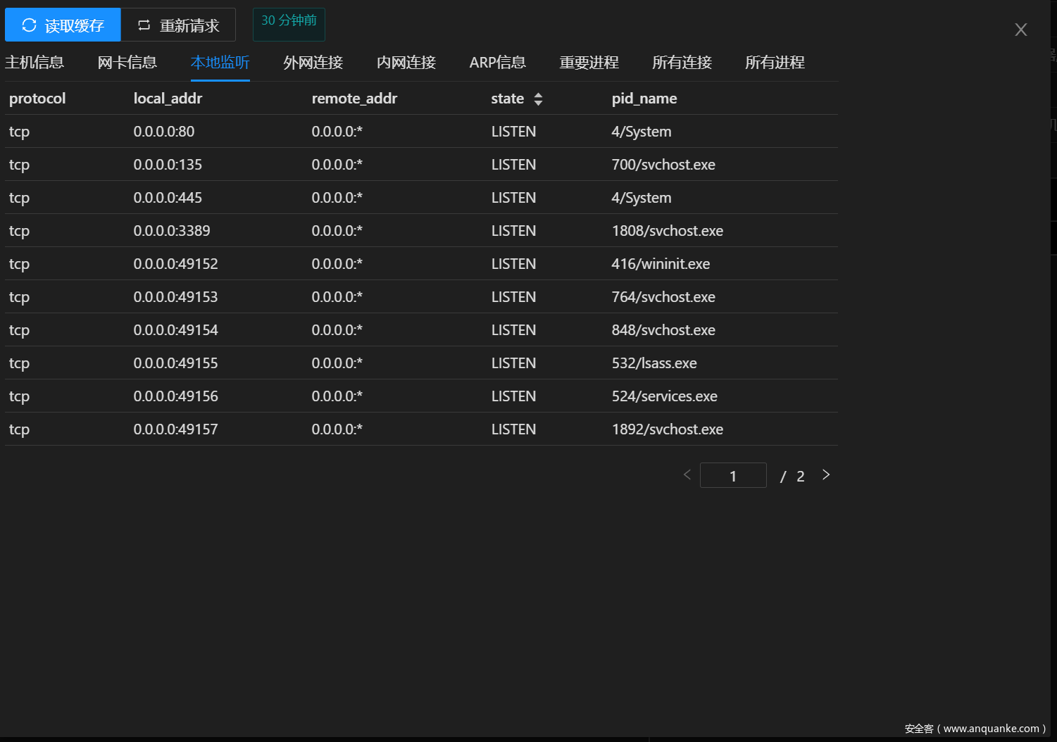 本地监听是当前主机针对网络的攻击面的汇总,例如查看是否监听80,443来分析是否对外提供Web服务,可否进行Webshell等持久化操作,是否监听3389来判断是否可以进行RDP登录,是否监听6379,1433等端口来判断是否启用了对应的数据库服务,可以用来提权.
