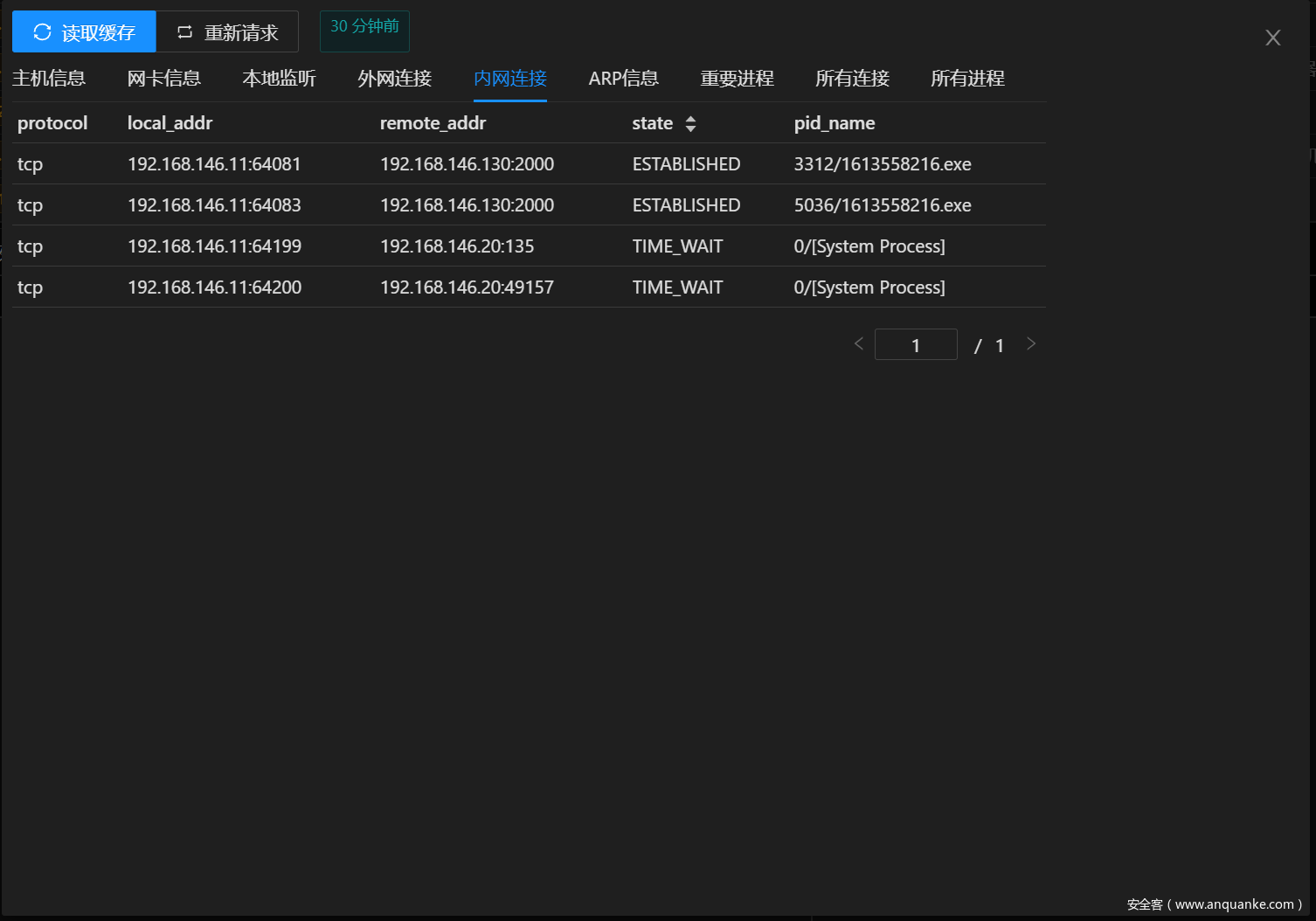 查看主机连接那些内网主机,有助于帮助我们确认下一步的渗透测试目标.如站库分离的网站数据库地址,内网业务服务器的IP地址及端口,内网OA服务器地址等.
