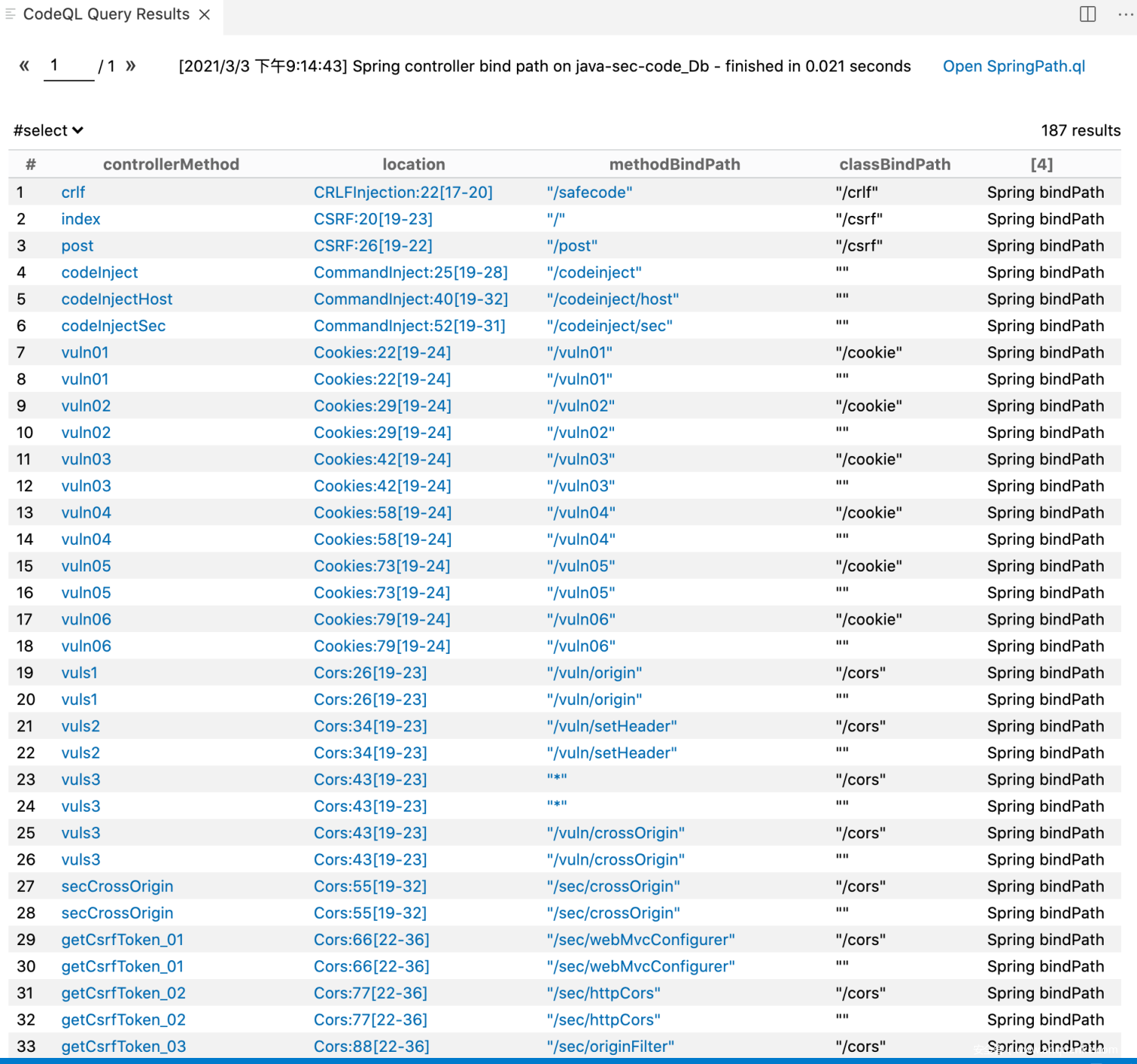 最后将FlowSourceCustom.qll import至 /java/ql/src/semmle/code/java/dataflow/FlowSources.qll就可以使用SpringPath.ql进行Spring的path查询