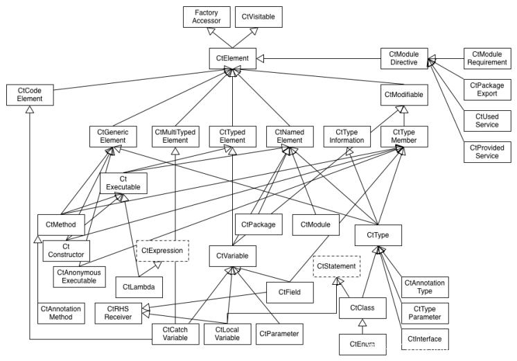 如图所示,所有元素都继承自CtElement(javadoc),后者声明一个父元素,该父元素表示源文件中的包含关系。例如,方法节点的父级是类节点。所有名称均以“ CT”为前缀,表示“编译时”。
