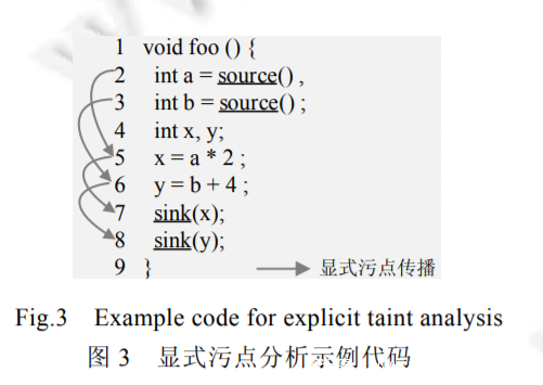 以图 3 所 示的程序为例,变量 a 和 b 被预定义的污点源函数 source 标记为污点源.假设 a 和 b 被赋予的污点标记分别为taint_a 和 taint_b.由于第 5 行的变量 x 直接数据依赖于变量 a,第 6 行的变量 y 直接数据依赖于变量 b,显式流分析会分别将污点标记 taint_a 和 taint_b 传播给第 5 行的变量 x 和第 6 行的变量 y.又由于 x 和 y 分别可以到达第 7 行和第 8 行的污点汇聚点(用预定义的污点汇聚点函数 sink 标识),图 3 所示的代码存在信息泄漏的问题.我们将在后面具体介绍目前污点传播分析中显式流分析面临的主要挑战和解决方法.