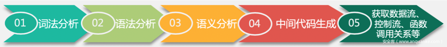 - 通过调用语言的编译器或者解释器把前端的语言代码(如JAVA,C/C++源代码)转换成中间代码(IR,intermediaterepresentation),将其源代码之间的调用关系、执行环境、上下文等分析清楚。