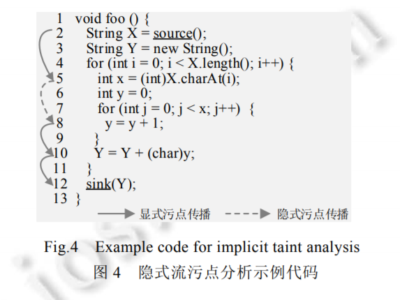 在图 4 所示的程序中,变量 X 是被污点标记的字符串类型变量,变量 Y 和变量 X 之间并没有直接或间接的数据依赖关系(显式流关系),但 X 上的污点标记可以经过控制依赖隐式地传播到 Y.