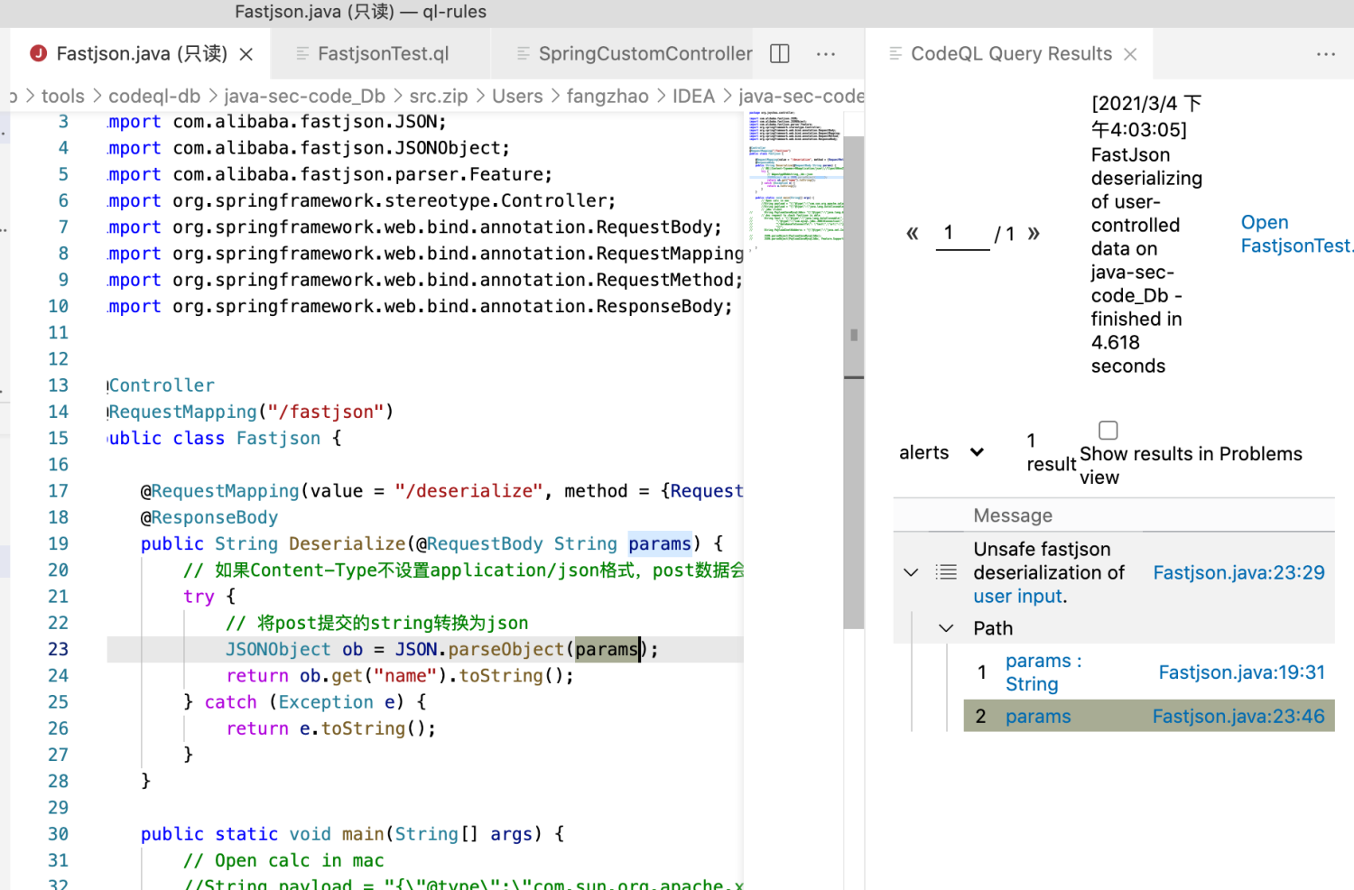 我们在来看看QL里的Fastjson查询